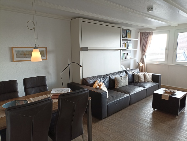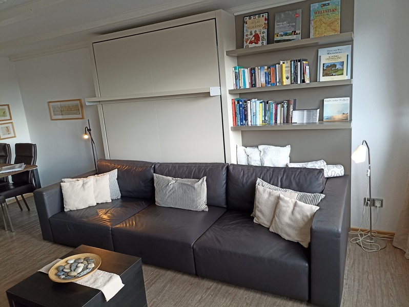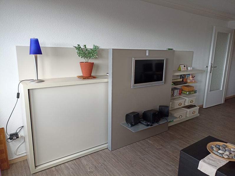Das Kombizimmer lässt sich im Handumdrehen Dank sehr hochwertiger neuer Schrankbetten von einem Wohnraum in einen Schlafraum mit 1 großen Doppelbett und einem Einzelbett verwandeln.