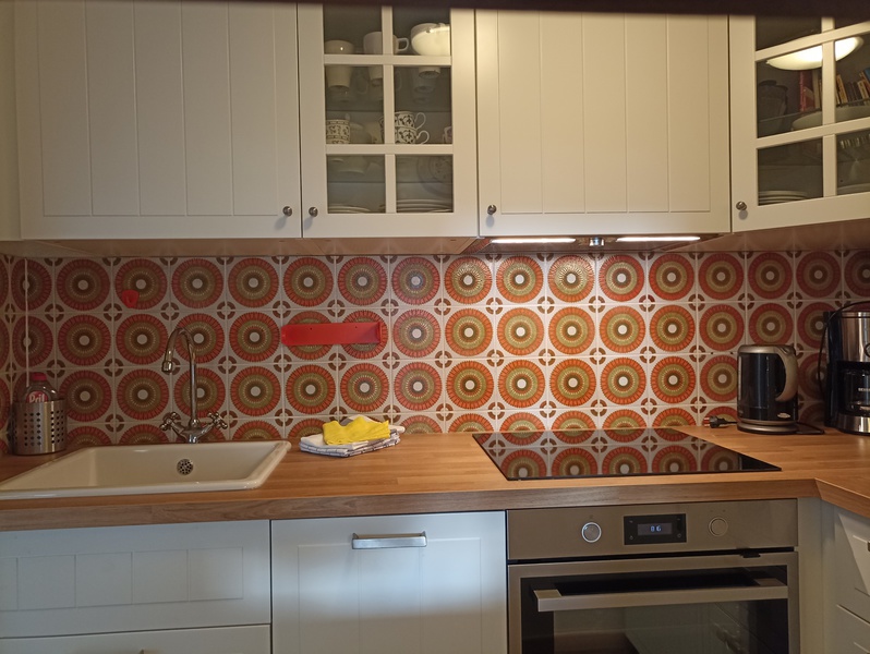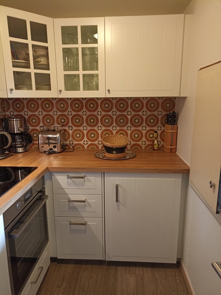 Die separate Küche mit Durchreiche zum Essplatz ist mit Spülmaschine, Kühlschrank, Induktions-Herd mit Backofen, Waffeleisen, Kaffeemaschine, Wasserkocher, Toaster und vielen weiteren nützlichen Küchenutensilien ausgestattet.