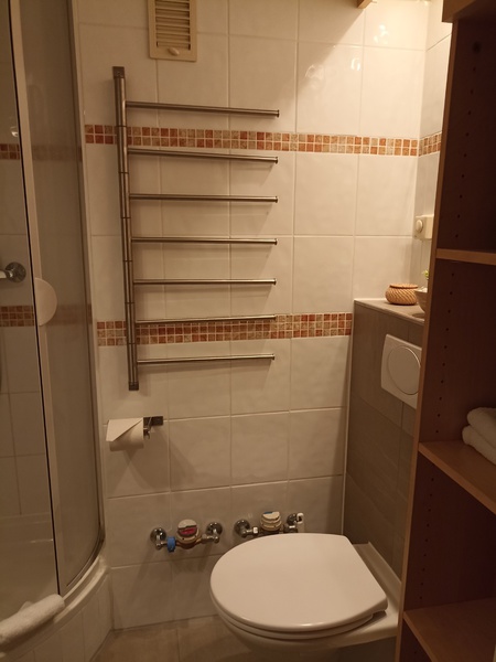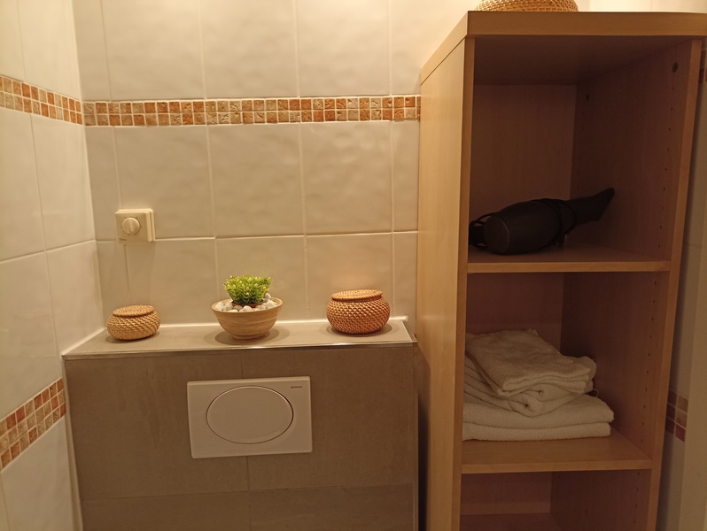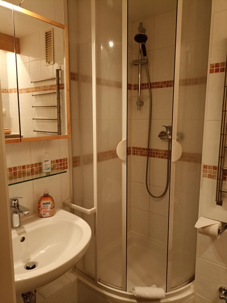 Unser Bad ist mit einer Dusche und WC sowie Fön ausstaffiert.