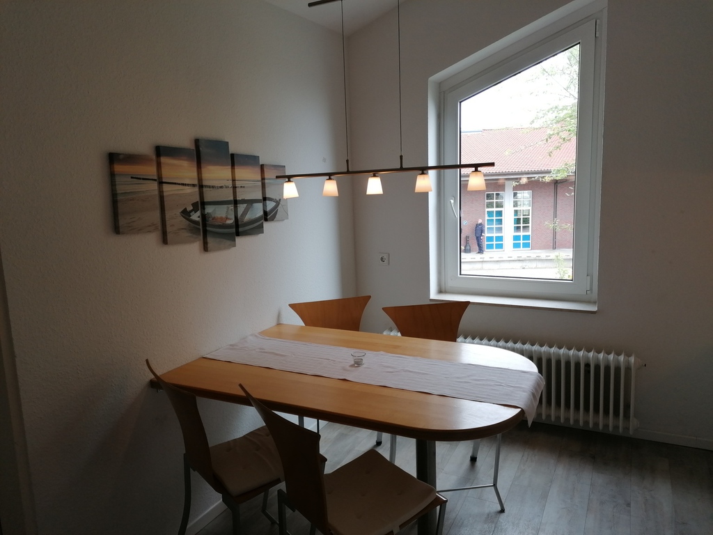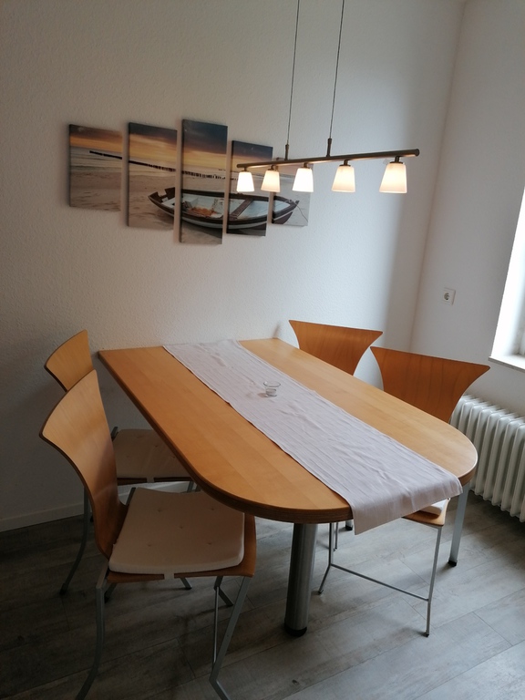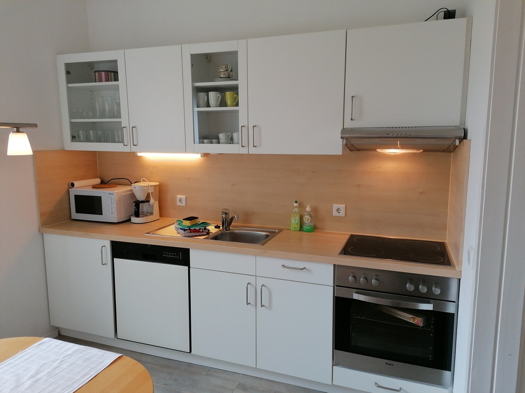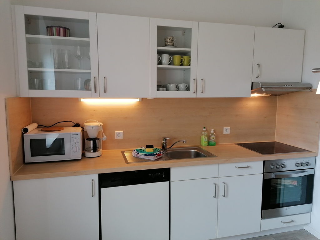 Die Küche mit großzügigem Esstisch für 4 Personen, ist mit Kühlschrank, 4 Platten Herd, Backofen, Spülmaschine, Mikrowelle, Kaffeemaschine, Wasserkocher, Toaster und vielem Weiterem ausgestattet.