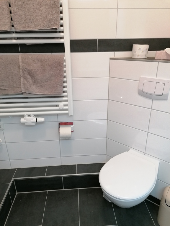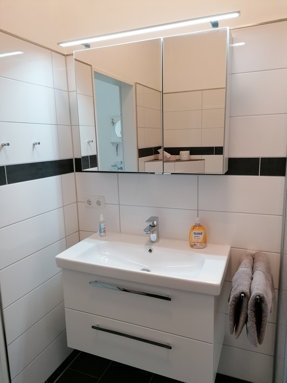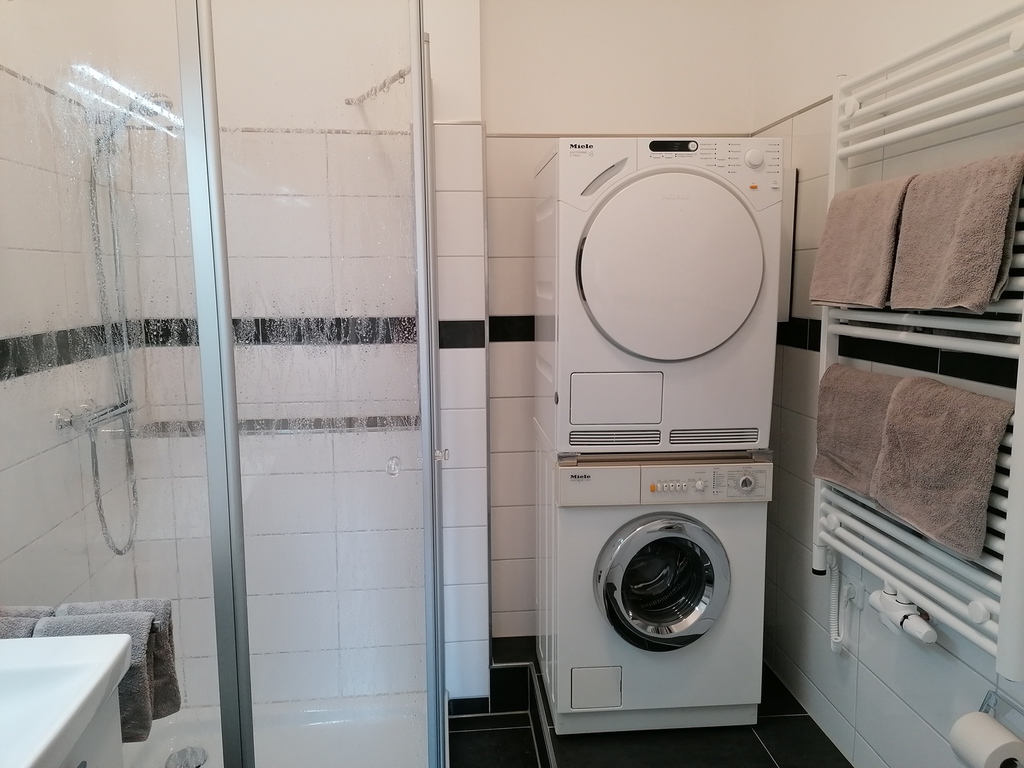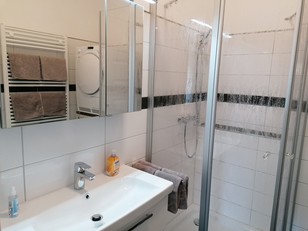 Das Duschbad wurde im Frühjahr 2021 frisch renoviert und dort befinden sich auch Waschmaschine und Trockner.