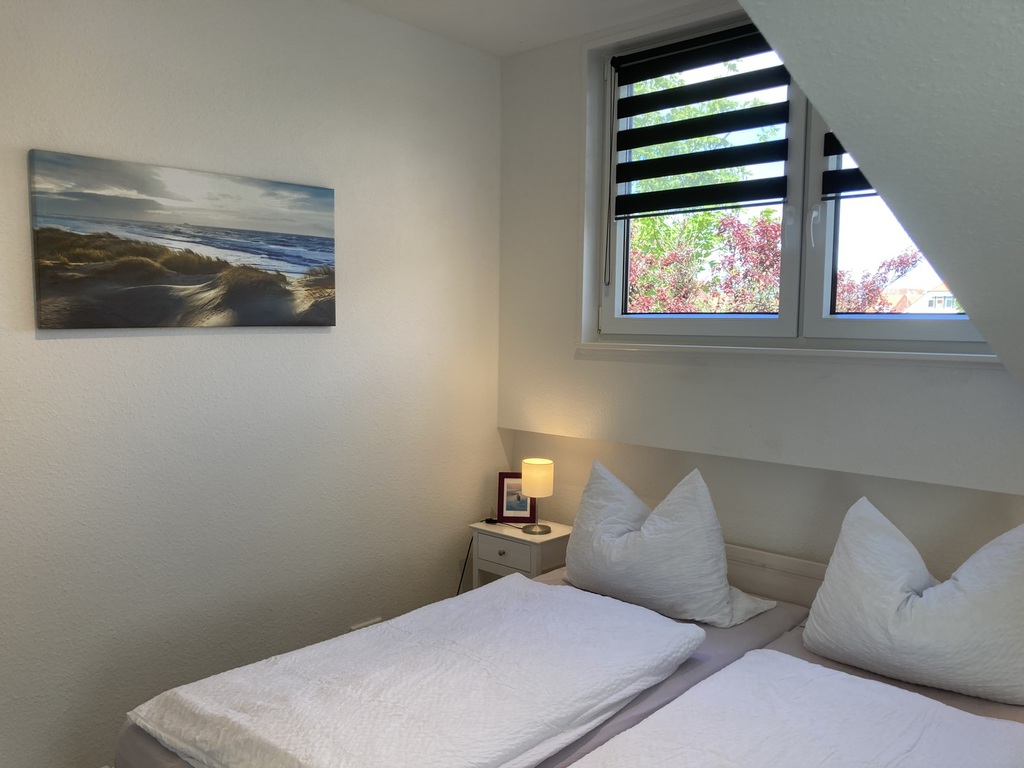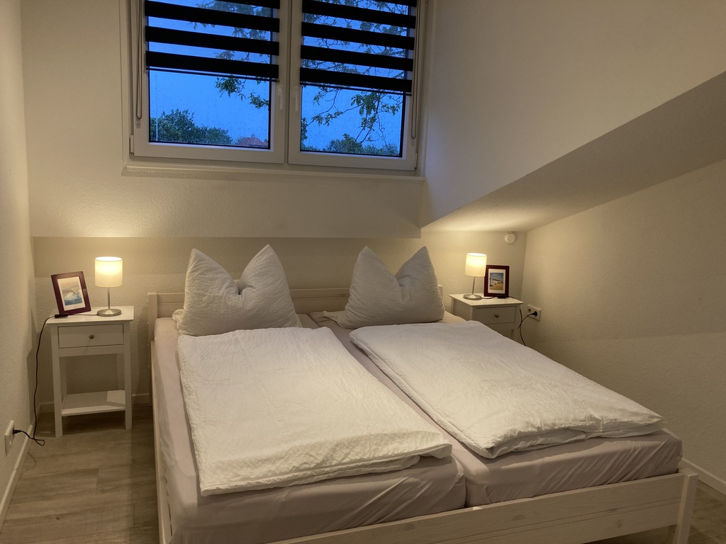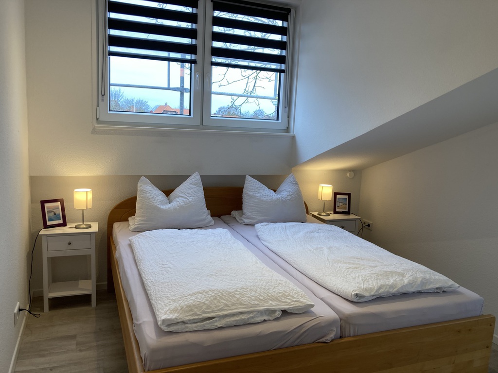 Im Elternschlafzimmer ist ein Ehebett und die Kinder schlafen in Einzelbetten..